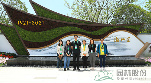 浙江園深化設(shè)計(jì)負(fù)責(zé)人高博、花境施工負(fù)責(zé)人張楠等在浙江園入口合影