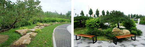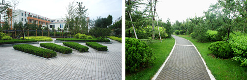 每個景觀節(jié)點上,植物的配置方法都是不一樣的,如在下沉廣場,主要是以小龍柏、金葉女貞等小灌木片植成方形或弧形,間或點綴石楠、梅樹,看起來規(guī)整、簡潔;而在設(shè)計風格為江南園林的南廣場上,是將貴重的造型油松單植,通過不同的組合,形成三個風格相近的綠島,周邊種植美人蕉、玉簪、竹子,并砌起白墻,上面開圓形拱門或圓窗,散發(fā)出詩意江南的靜謐和婉約氣息。“游憩步道是貫穿整個景觀的軸線,為了形成曲徑通幽的景觀效果,我們將對植、孤植、叢植都多種方法結(jié)合運用,特別是在三叉路口,多種植海棠、櫻花、杏花等,一方面,花開的時候,綠葉間繁花點點,會吸引人們不斷向前探尋更多的美景;而花落之后,茂密的枝葉又形成隱隱約約的視覺感受,前方轉(zhuǎn)過彎后風景什么樣,又讓人很想去看看。”高經(jīng)理笑著說。
