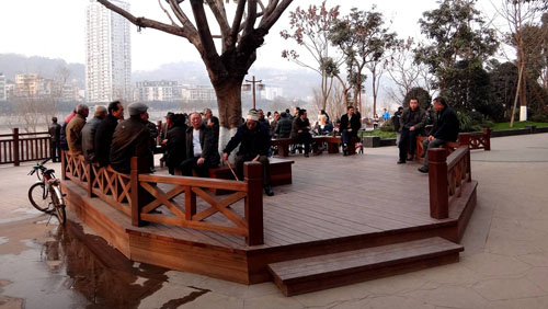 “我們將館驛嘴廣場(chǎng)的設(shè)計(jì)基調(diào)定位為‘奢華’, 是指使用的材料要‘真材實(shí)料’,施工工藝要經(jīng)得起考驗(yàn)?!崩顗廴蔬呑哌吔榻B說(shuō),“漣漪廣場(chǎng)上的冰裂紋圖案鋪裝,采用兩種顏色的花崗巖,為了營(yíng)造出氣泡的效果,特意將圓形的花崗巖用不繡鋼鑲邊,加深色彩,形成對(duì)比,從而營(yíng)造出‘激起漣漪無(wú)數(shù)’的奧妙,實(shí)現(xiàn)館驛嘴這艘航船動(dòng)起來(lái)的效果,為了保證施工質(zhì)量,工人都是從杭州請(qǐng)來(lái)的專業(yè)人員;所有的青石鋪裝,全部采用人工石刻,我們現(xiàn)在看到的這些菠蘿面、荔枝面等紋路,是幾百名能工巧匠一鑿一鑿刻出來(lái)的,這種自然、厚重、原生態(tài)的質(zhì)樸美,是機(jī)器切割無(wú)法實(shí)現(xiàn)的,更重要的是,大量青石的運(yùn)用,可以有效抵抗洪水的沖刷,就算50年一遇的洪水來(lái)襲也不怕;反映瀘州民俗生活的三缺一麻將雕塑,則是用全銅制作,人物形態(tài)惟妙惟肖,紋路雕刻精致細(xì)膩,彰顯出工藝的用心和考究;亭、廊等木結(jié)構(gòu)建筑則采用實(shí)木制作,對(duì)木質(zhì)材料和厚度都有嚴(yán)格的要求,達(dá)到美觀與實(shí)用兼顧的要求?!?/p>
