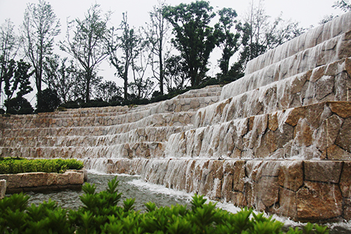 入口水景開(kāi)闊大氣,行道樹(shù)陣整齊劃一。一場(chǎng)歌劇的序曲,不管是澎湃激昂,還是歡快活躍,抑或是柔情舒緩,都將對(duì)整個(gè)局情起著舉足輕重的作用。入口景觀的作用同樣如此,它是整個(gè)園林工程留給人們的第一印象。走進(jìn)項(xiàng)目主入口,寬40米、高10米的寬闊水景,高達(dá)7級(jí)的層階落差,水流層層跌落間,水聲轟鳴,仿佛一道瀑布橫掛眼前。3000平方米的地面鋪裝,全部采用50毫米厚的深灰色和芝麻白花崗巖,走在上面,平坦、踏實(shí)。兩側(cè)的花壇,邊緣鋪設(shè)手法也呈臺(tái)階狀,蘑菇石貼面,花崗巖壓邊,與水景遙相呼應(yīng)?;▔械闹参铮蠈舆x用香樟、銀杏、櫸樹(shù),中層用櫻花、紅葉李,下層用麥冬、水蠟、花石榴及草花,再加上造型樹(shù)的點(diǎn)綴,營(yíng)造出群島效果,使得整個(gè)入口景觀莊重典雅,大氣天成。