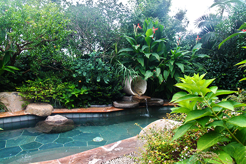 露天泳池?zé)釒эL(fēng)情,溫泉泡池仿若天成。露天泳池區(qū)景觀獨(dú)具特色,選用華棕、棕櫚、布迪椰子、加拿利海棗等熱帶植物作為主景,營(yíng)造出簡(jiǎn)約大方、層次分明的濃郁熱帶園林風(fēng)情。為了提高這些熱帶植物的成活率,降低后期的養(yǎng)護(hù)成本,這批植物都經(jīng)過(guò)馴化,較能適應(yīng)吳江的氣候條件。該區(qū)面積較大,從酒店的觀景平臺(tái)上往下看,泳池中間的小島就像彎彎的小船,仿佛要順流而下;水質(zhì)清澈見(jiàn)底,水底大面積的藍(lán)色和黃色玻璃馬賽克,營(yíng)造出波光鱗鱗的效果,流動(dòng)的線條瞬間充滿了生機(jī)和活力,整個(gè)泳池仿佛都動(dòng)了起來(lái)。
