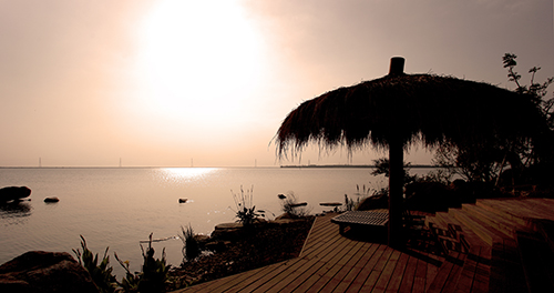 觀景平臺(tái)視野開(kāi)闊,濱湖風(fēng)光水天一色。臨湖的觀景平臺(tái),原色的木質(zhì)鋪裝,素樸的茅草亭,寬大的躺椅,營(yíng)造出一個(gè)自在的小天地。這處觀景平臺(tái),背后是珍珠泉泡池,泡完溫泉,可以直接來(lái)到觀景平臺(tái),遠(yuǎn)眺太湖的煙波浩渺,水天一色。