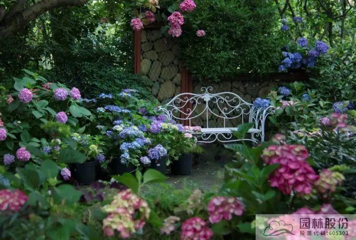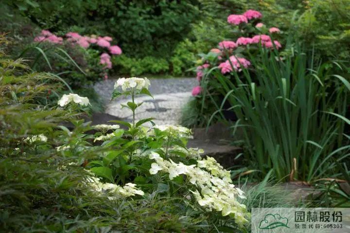 ▲園林股份自主選育的‘青山’系列繡球在畫境·青山湖花園中心室外景觀展示區(qū)中的應(yīng)用
