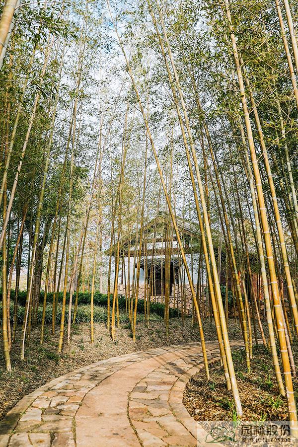 竹是新時(shí)代杭州重要的文化載體之一。因此入口左側(cè)選擇西湖環(huán)境中“茂林修竹”之元素,以毛竹種植為主,形成夾景,曲徑通幽。