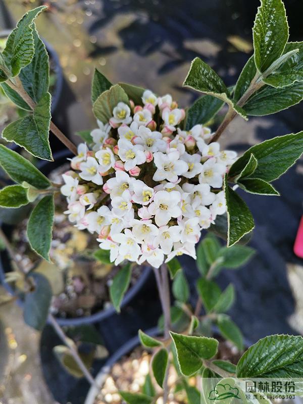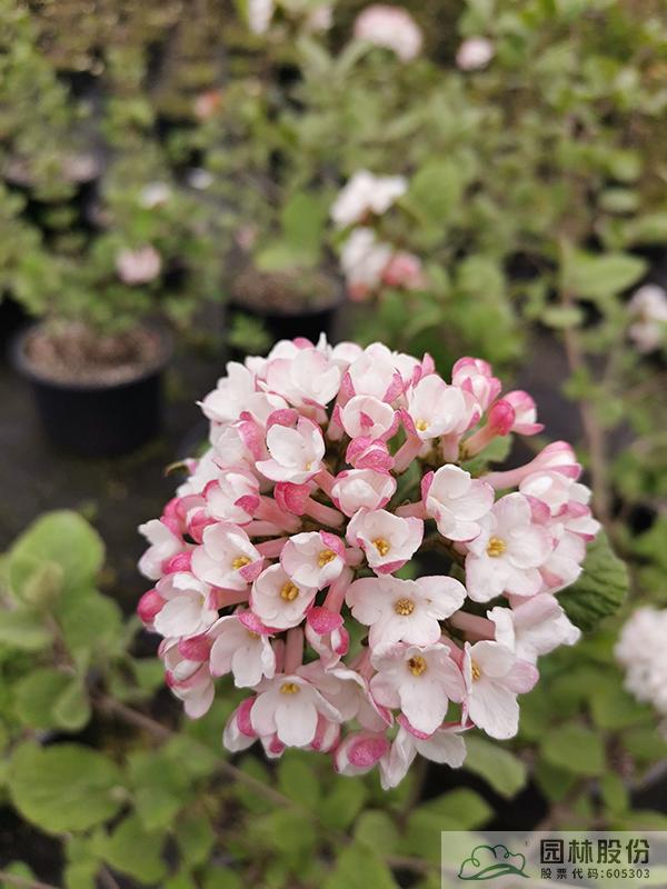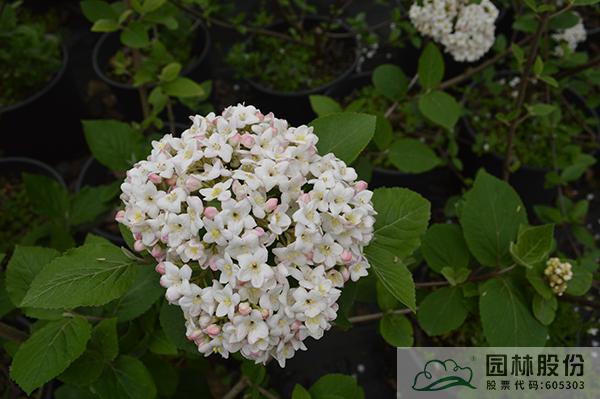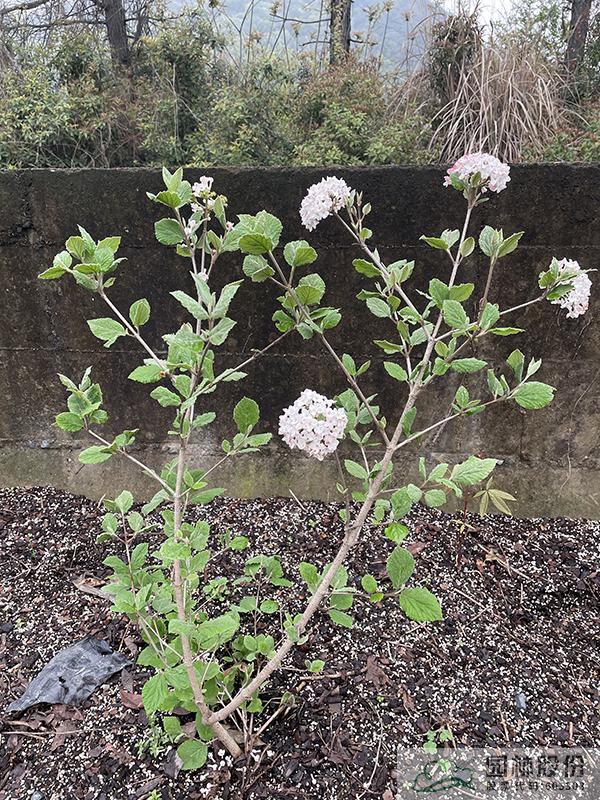 忍冬科莢蒾屬,落葉灌木,株高3-4.5 m,為瓊花和紅蕾莢蒾的雜交種。葉片較厚,較大,到秋季變成酒紅、橙紅或紫色色調(diào)。聚傘花序花蕾粉紅色,開放后白色,聚集似小雪球,具芳香,花徑8-14cm,花期3-4月。喜光,半陰環(huán)境也生長(zhǎng)良好,生長(zhǎng)速度中等;擇土不嚴(yán),微酸性、中性至微堿性土壤均可生長(zhǎng),尤喜濕潤(rùn)、排水良好的富含有機(jī)質(zhì)土壤;抗寒性強(qiáng);耐修剪,適合自然風(fēng)格的工程應(yīng)用或庭院觀賞。