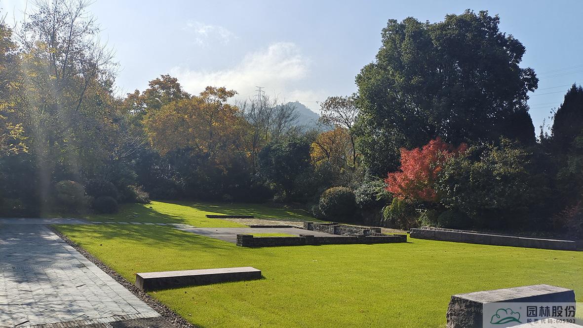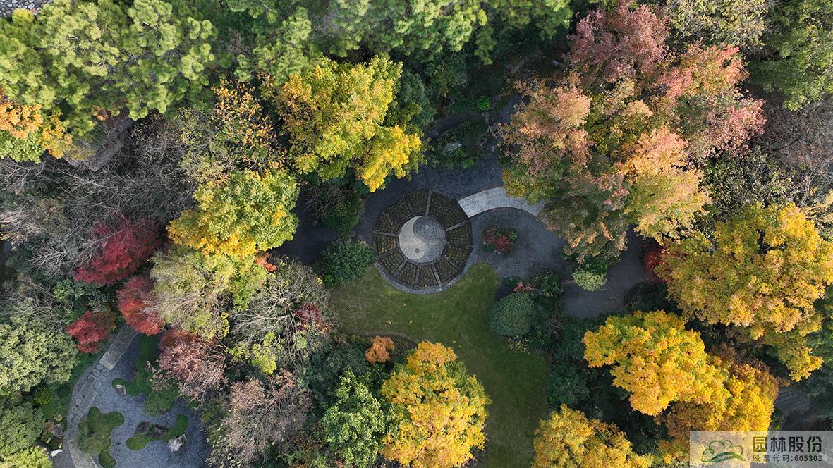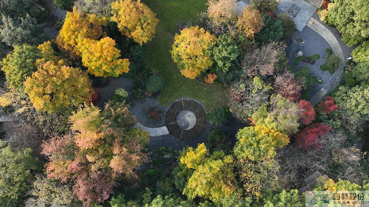 俯視畫(huà)境園南園,楓香林在陽(yáng)光中的色彩愈加斑駁,無(wú)患子綠色尚未全部褪去,金黃色樹(shù)冠愈加油亮,盡顯英式風(fēng)景林的自然、灑脫。