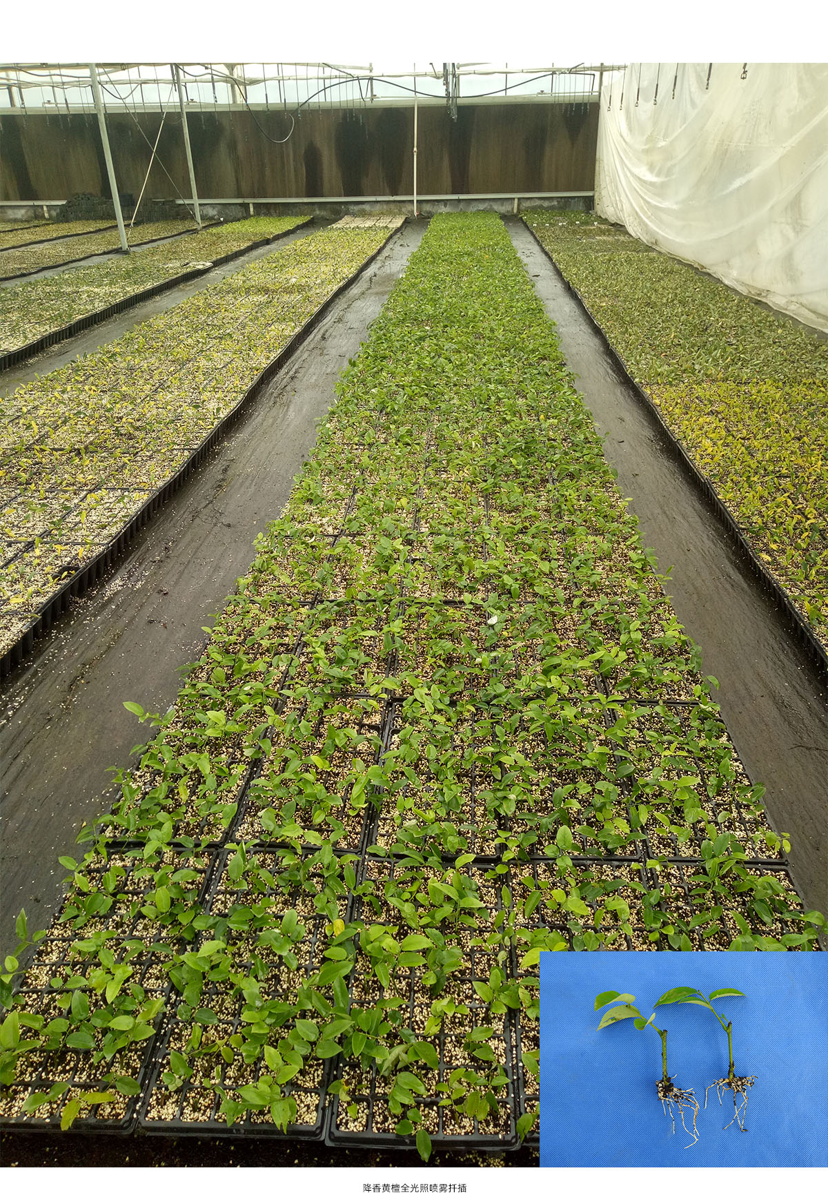 全光照噴霧扦插技術(shù)具有生根期短、成活率高和操作簡(jiǎn)單等優(yōu)點(diǎn)。研究院已建立了桂花、冬青、降香黃檀、新優(yōu)宿根植物等數(shù)百種植物的全光照噴霧扦插技術(shù)體系,年度育苗量200多萬(wàn)。