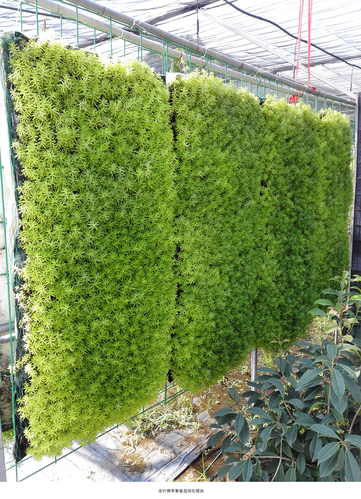 利用土工布、巖棉剪裁成一定規(guī)格與金葉佛甲草相結(jié)合,并運(yùn)用工程技術(shù),制作出四季便攜式、輕型、降溫的金葉佛甲草垂直模塊。達(dá)到立竿見影的景觀效果且生產(chǎn)周期短的目的,有利于大規(guī)模推廣運(yùn)用。